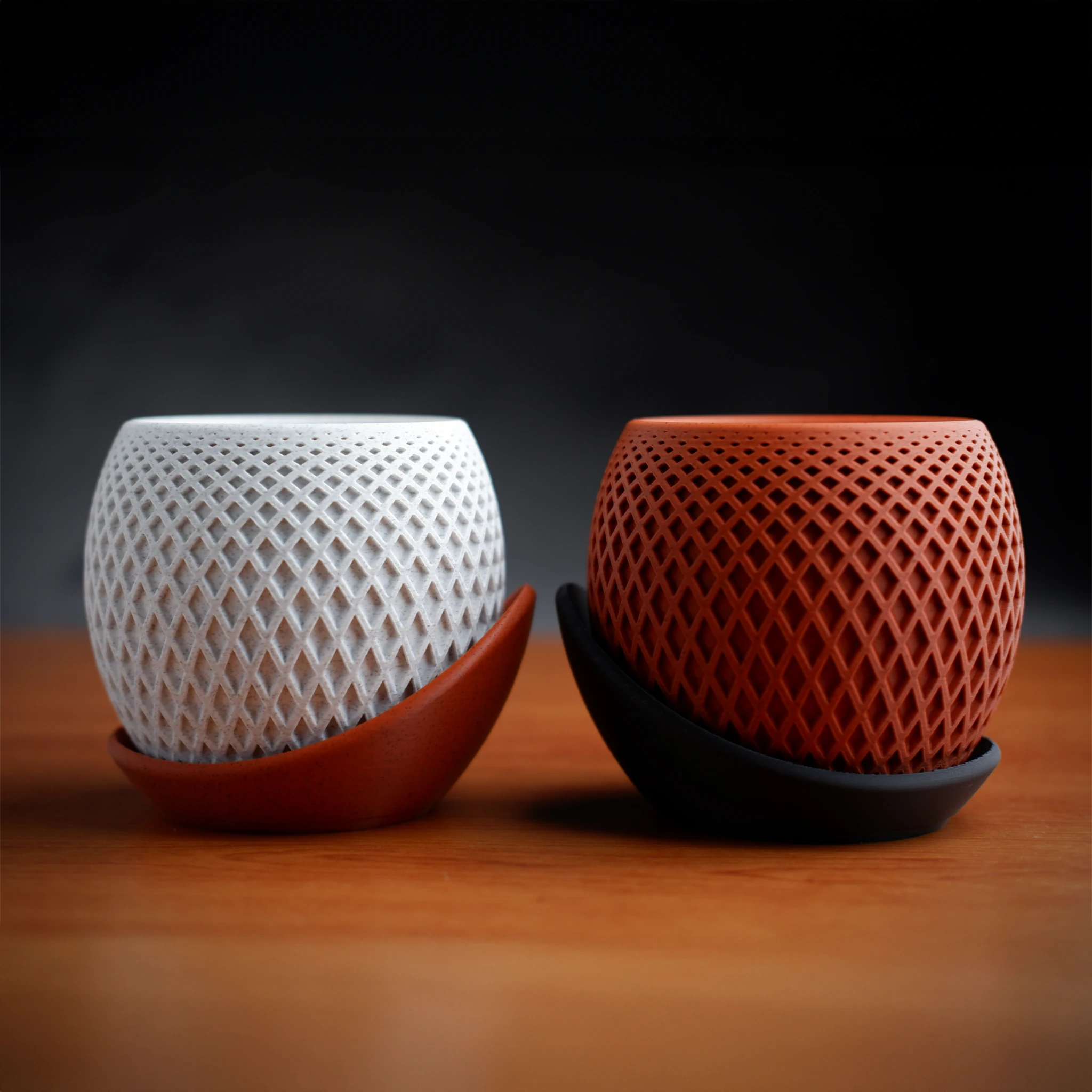 Standaardkleuren zijn PLA Marble White voor de pot en Matte Terracotta voor de plaat.